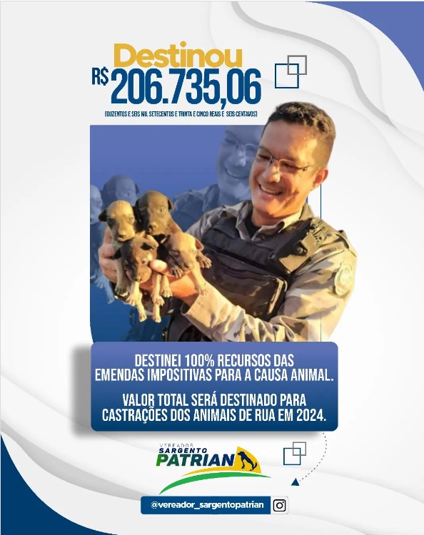 Vereador Patrian destina 100% de suas emendas impositivas para castração de animais de rua, em Patos