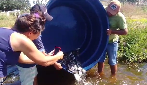 Os pescadores (as) capturam os peixes de açude que estão com o volume de água baixo e colocam nos açudes maiores.