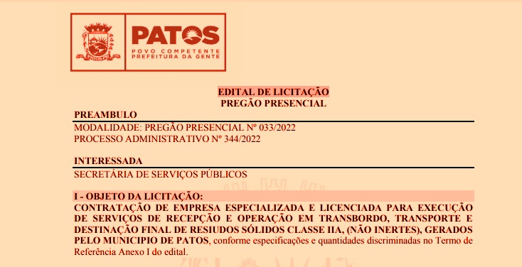 Prefeitura de Patos publica pregão presencial para garantir transporte e destinação de resíduos sólidos para Aterro Sanitário
