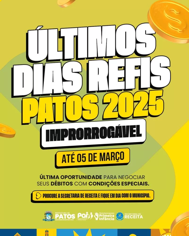 Prefeitura de Patos encerra o REFIS na próxima quinta-feira, 05 de março
