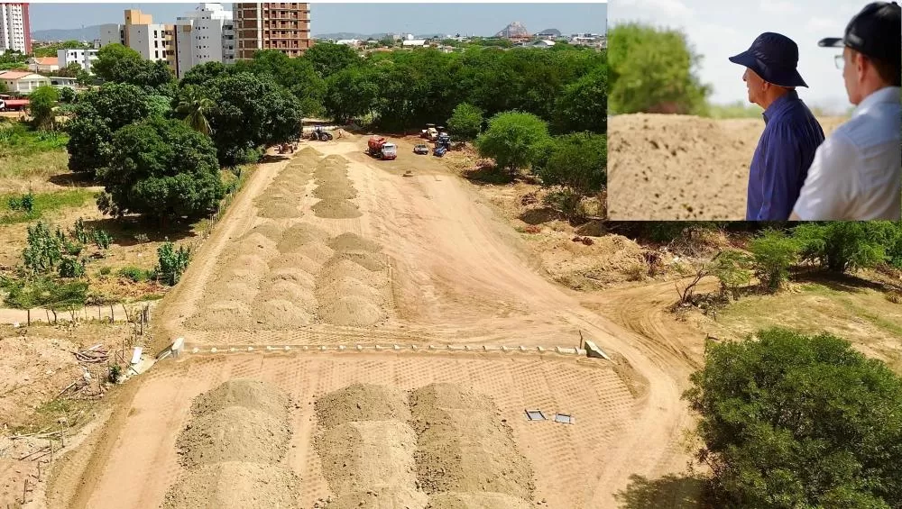 As equipes de trabalho estão atualmente em fase de terraplanagem e instalação de sistemas de drenagem.