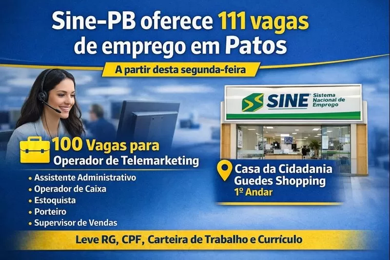 Sine-PB oferece 111 vagas de emprego em Patos a partir desta segunda-feira
