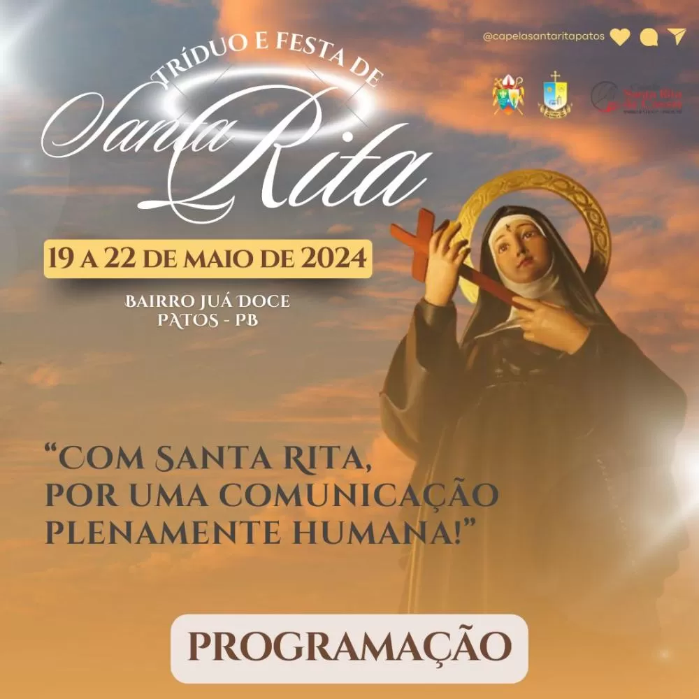 O dia de Santa Rita será marcado pela missa votiva, às 19h, presidida pelo padre Lucivaldo.