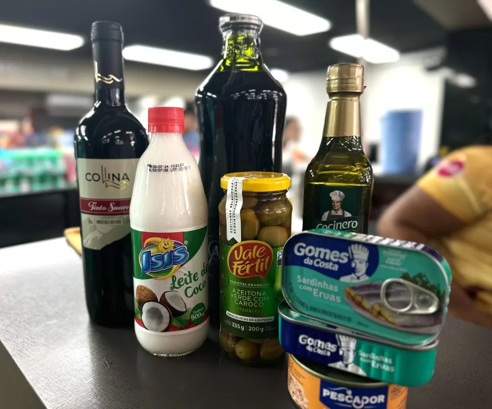 Entre os itens pesquisados estão: sardinha, atum, leite de coco, azeite, azeitona, batata, suco de uva integral e vinho suave.