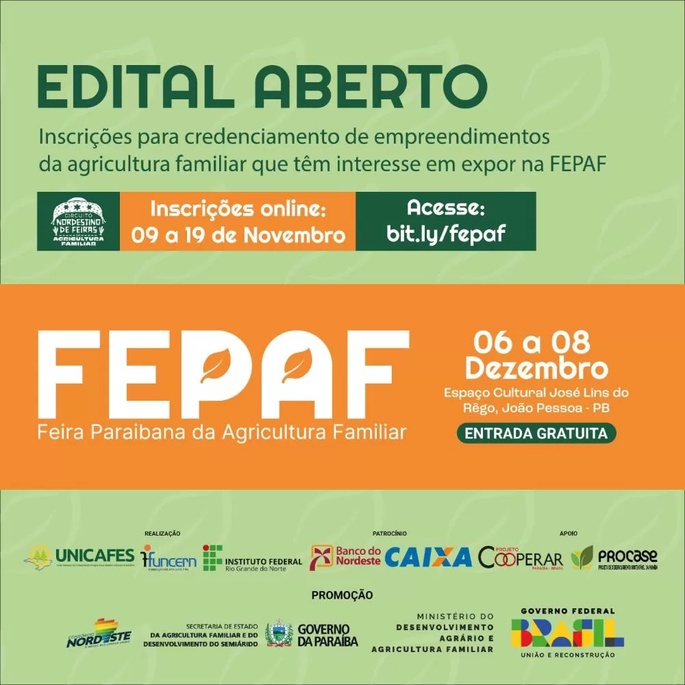 Paraíba lança edital para credenciar empreendimentos da agricultura familiar expor na FEPAF