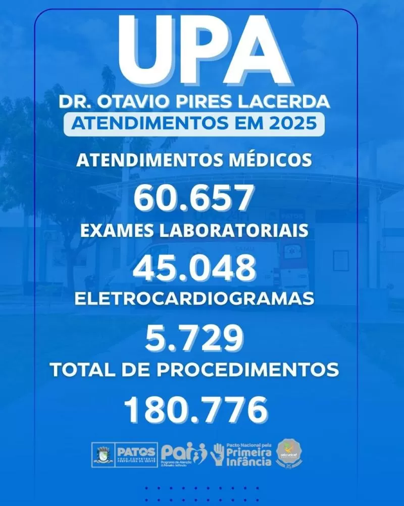 A Prefeitura de Patos, por meio da Secretaria Municipal de Saúde, divulga os dados de atendimentos realizados em 2025 na Unidade de Pronto Atendimento (UPA) Dr. Otávio Pires Lacerda. Os números reforçam a importância da unidade para a rede municipal de saúde e o compromisso da gestão com a assistência à população.