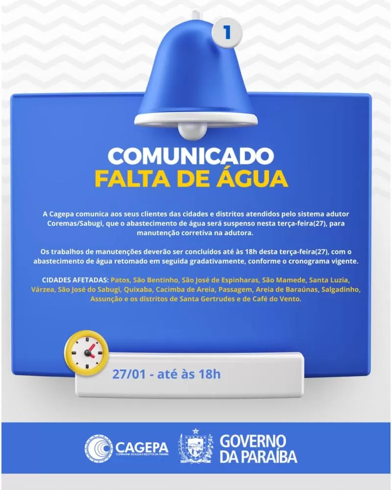 A Companhia de Água e Esgotos da Paraíba (Cagepa), por meio da Regional das Espinharas, informou que o abastecimento de água será suspenso nesta terça-feira (27) em Patos e em diversos municípios do Sertão paraibano. A interrupção ocorre em razão de uma manutenção corretiva na adutora do sistema Coremas/Sabugi.