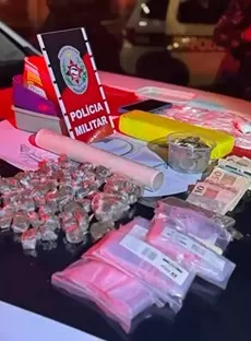 Na ocorrência, foram apreendidos R$ 3.412,00 em espécie e R$ 45,40 em moedas, além de um tablete de maconha pesando aproximadamente 605 gramas, 73 porções da mesma substância (cerca de 406 gramas), 106 papelotes de cocaína e uma porção maior da droga com aproximadamente 10 gramas.
