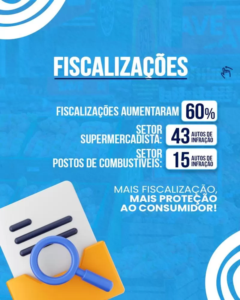 O número de fiscalizações também aumentou consideravelmente, em que no ano passado houve um índice de 60% a mais em relação a 2024 e, tendo a observação de que o ramo supermercadista foi o setor mais infrator no comércio local, com 43 autos de infração lavrados em 2025. Em seguida vem os postos de combustíveis com 15 autos de infração.