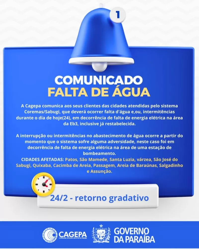 A Cagepa, por meio da Regional das Espinharas, em Patos, informou que cidades atendidas pelo sistema Coremas/Sabugi podem registrar falta de água ou intermitências no abastecimento nesta terça-feira (24).