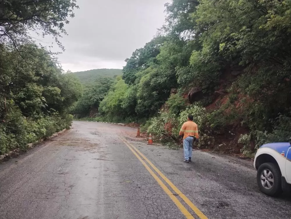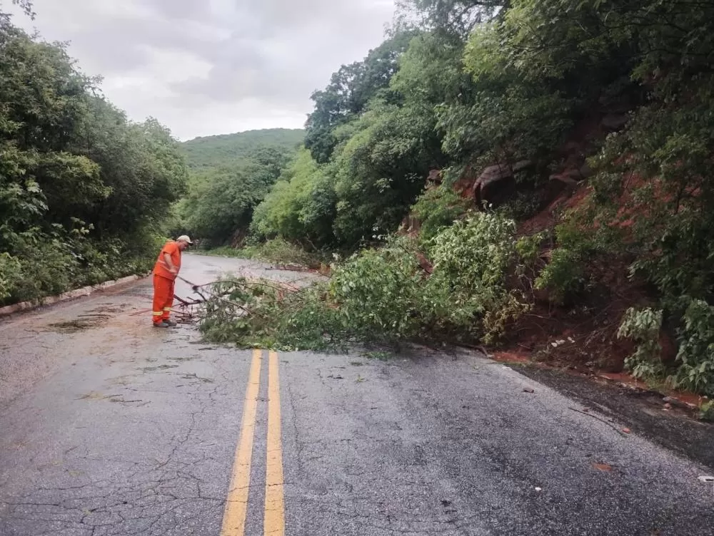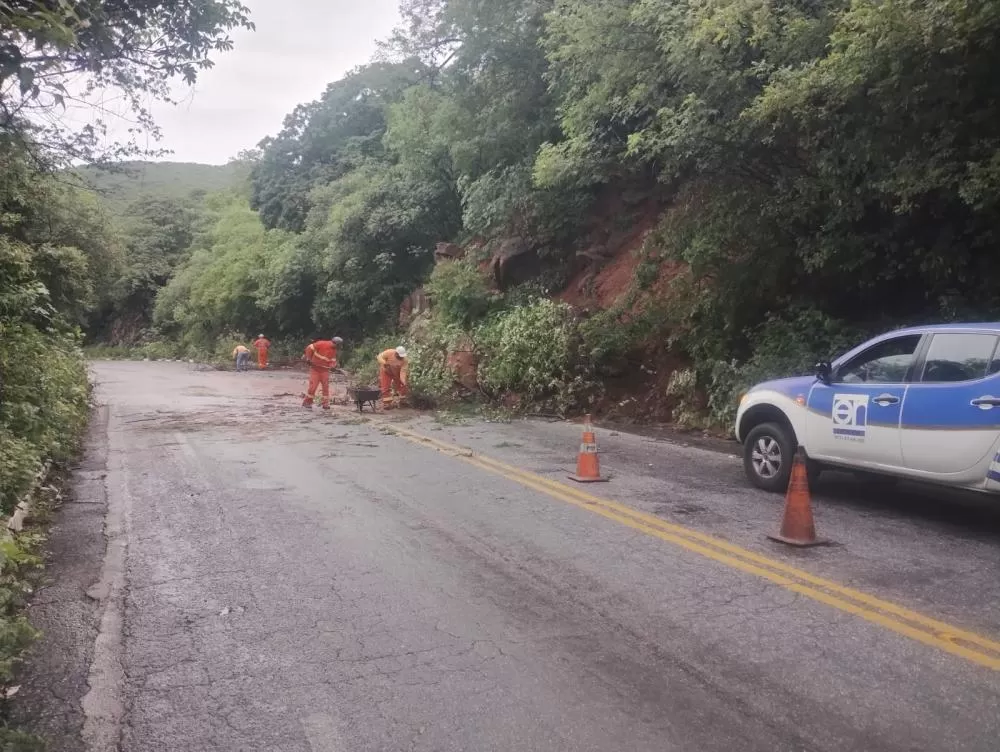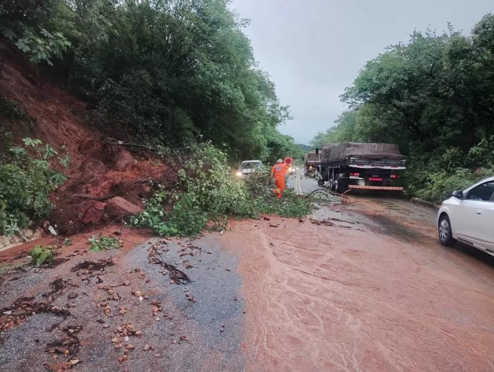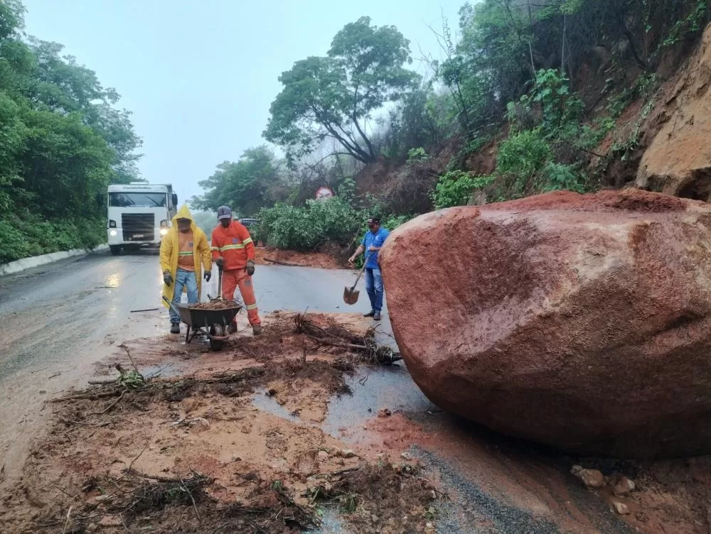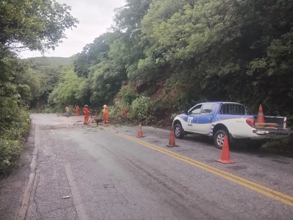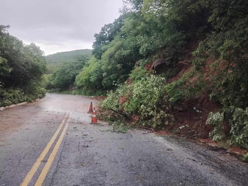 As imagens mostram pontos da via com acúmulo de barro escorrendo pela pista, além de blocos de pedra que se desprenderam da encosta, comprometendo o tráfego de veículos e exigindo atenção redobrada dos motoristas que trafegam pelo trecho.
