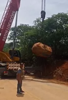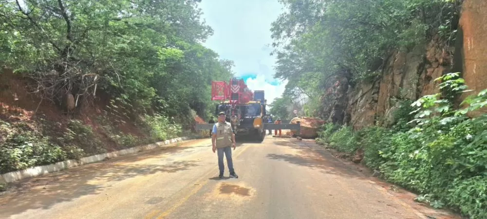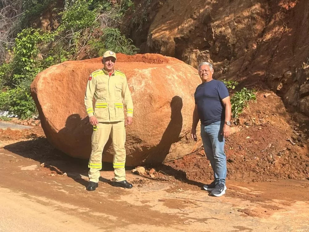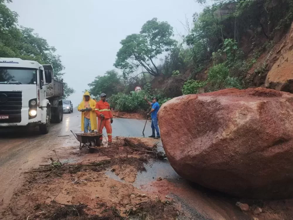 As imagens registram o cenário encontrado pelas equipes: pista coberta por lama e terra, vegetação espalhada às margens da rodovia e enormes blocos de rocha desprendidos da parede da serra. Em um dos pontos mais críticos, a pedra de grandes proporções ficou sobre a via, exigindo uma operação cuidadosa, com apoio de máquinas e bloqueio temporário do tráfego para garantir segurança.