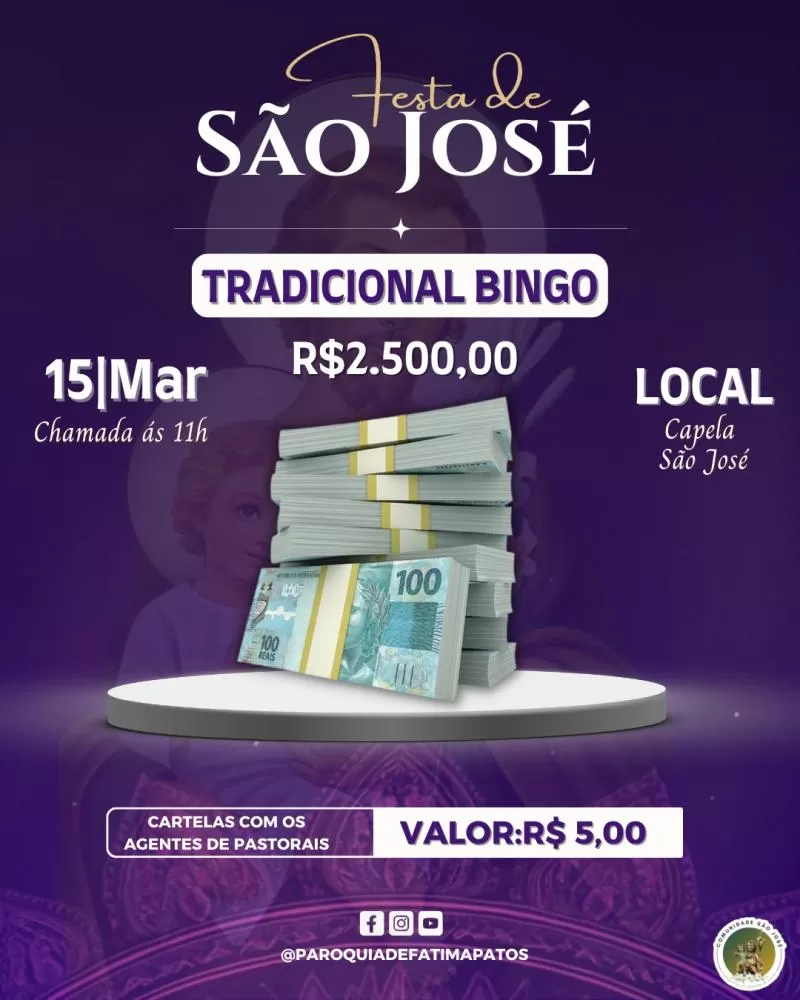 Dentro da programação social, no dia 15 de março, às 11h, será realizado um bingo no pátio da capela com premiação de R$ 2.500,00. A cartela custará R$ 5,00. O evento também contará com venda de rubacão com galinha e apresentação de música ao vivo.