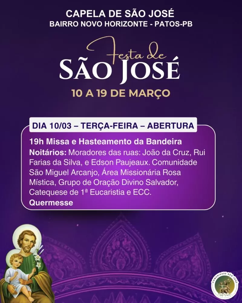 A comunidade Novo Horizonte, em Patos, inicia nesta terça-feira (10), às 19h, a tradicional Festa de São José, padroeiro da localidade. A abertura contará com o hasteamento da bandeira e a celebração da Missa de abertura presidida pelo padre Luiz Gonzaga.