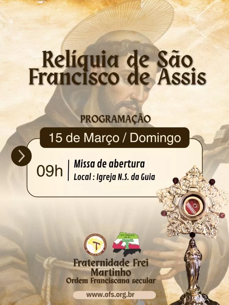 A cidade de Patos recebe a partir deste domingo (15) a peregrinação da relíquia de São Francisco de Assis, dentro das celebrações do ano jubilar franciscano. A abertura da programação ocorre às 9h, com missa na Catedral de Nossa Senhora da Guia, presidida pelo bispo diocesano Dom Eraldo Bispo da Silva.