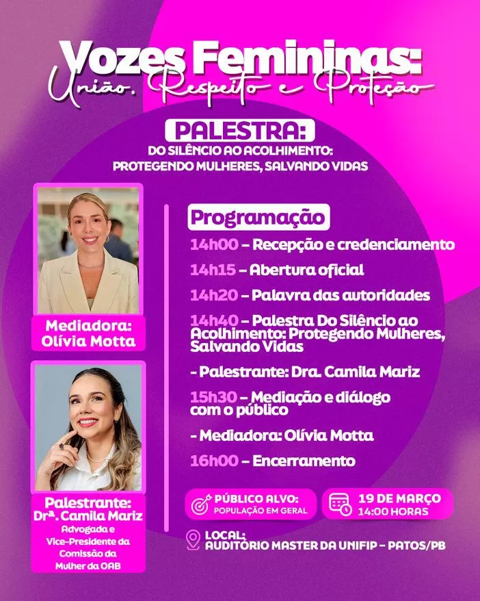 A cidade de Patos recebe no próximo dia 19 de março a palestra “Do Silêncio ao Acolhimento: Protegendo Mulheres, Salvando Vidas”, dentro do evento “Vozes Femininas: União, Respeito e Proteção”. A iniciativa será realizada a partir das 14h no auditório master do Centro Universitário de Patos (UNIFIP) e é aberta ao público em geral.