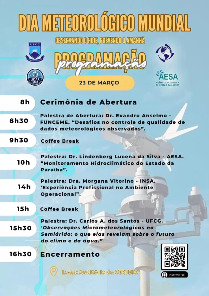 Com o tema “Observando o hoje, prevendo o amanhã”, a iniciativa contará com palestras sobre qualidade de dados meteorológicos, monitoramento hidroclimático e experiências no ambiente operacional. Entre os convidados estão especialistas de instituições como FUNCEME, AESA, INSA e a própria UFCG.