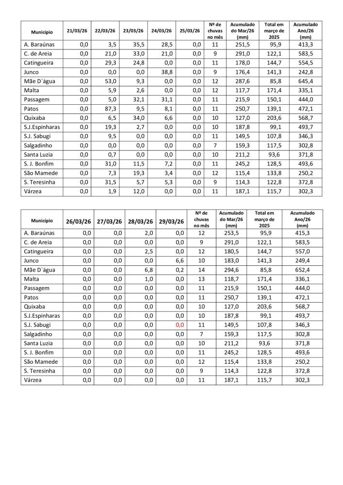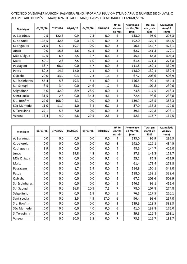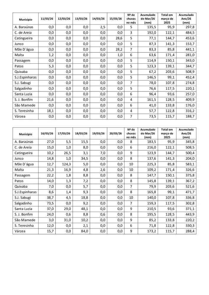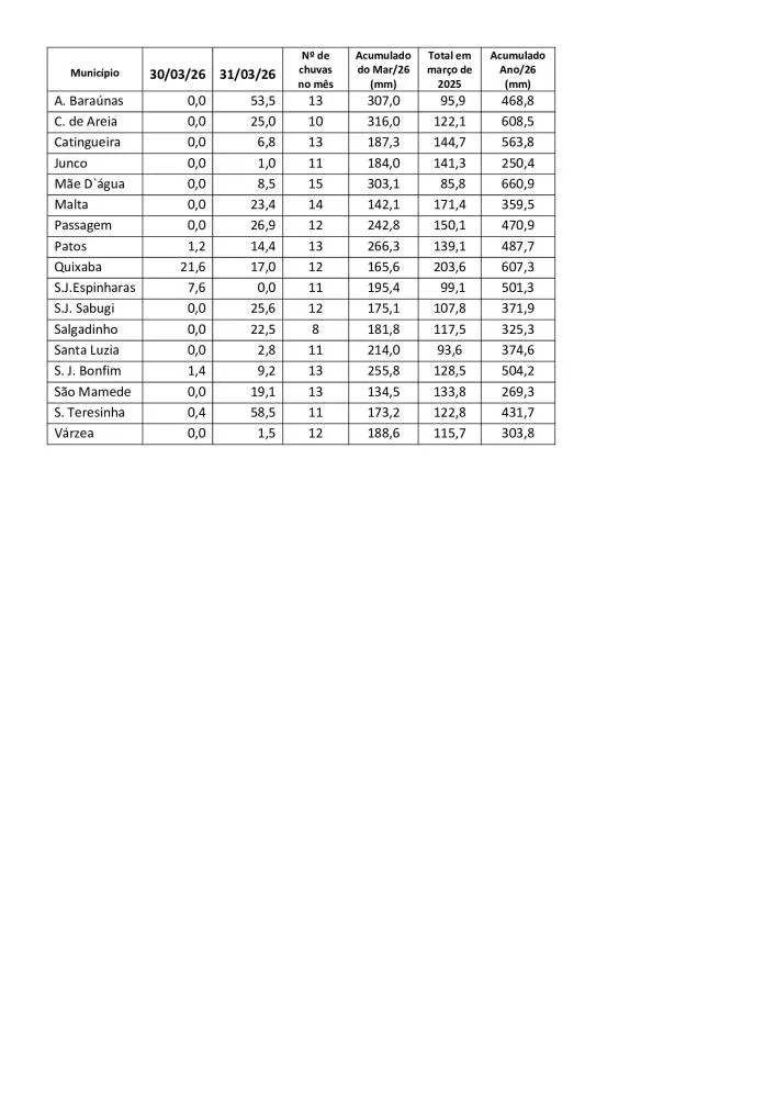 O município de Mãe D’água registrou o maior volume de chuvas da região em março de 2026, com 303,1 mm acumulados no mês e 660,9 mm no ano até o dia 31. Os dados constam em relatório elaborado pelo técnico da EMPAER, Marconi Palmeira Filho.