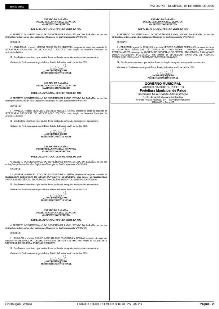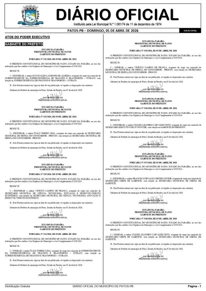 O Diário Oficial do Município de Patos deste domingo (5) trouxe uma série de mudanças na estrutura administrativa da Prefeitura de Patos, com exonerações, nomeações e remanejamentos em cargos de primeiro escalão e funções estratégicas. As portarias são assinadas pelo prefeito Jacob Souto (Rede).
