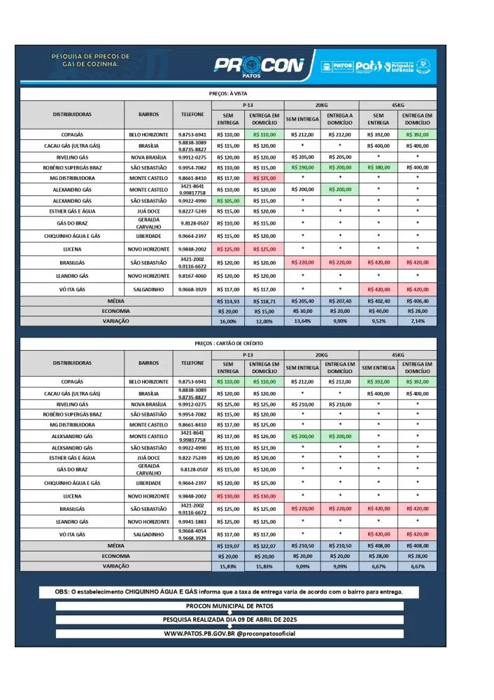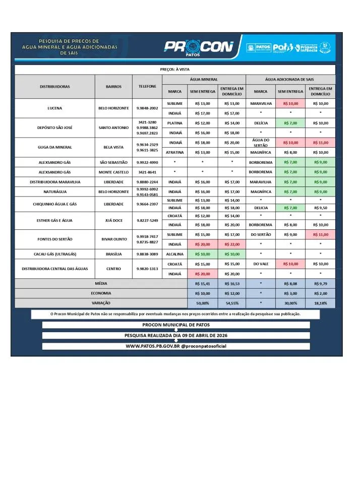 O Procon/Patos realizou, nesta quinta-feira, dia 9 de abril, a pesquisa de preço de gás de cozinha, de água mineral e água adicionada de sais.