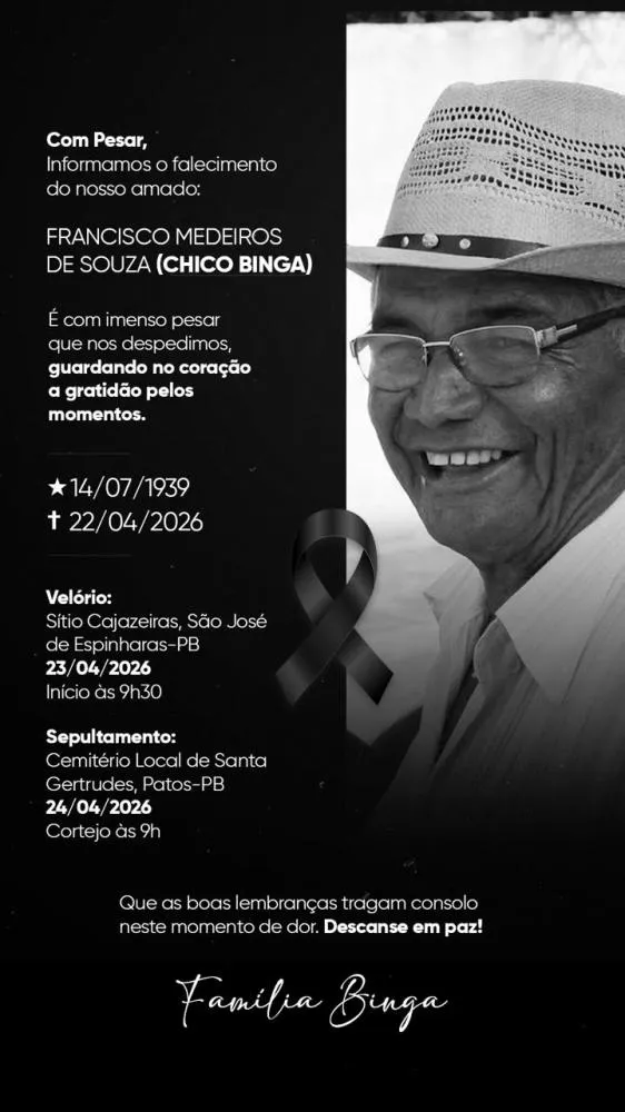 Faleceu nesta quinta-feira (23), aos 86 anos, Francisco de Medeiros Sousa, conhecido como Chico Binga, figura querida e respeitada em toda a região. A homenagem é do chefe da residência do D.E.R em Patos, Madiel Conserva, que destacou a trajetória de vida e os ensinamentos deixados pelo amigo.
