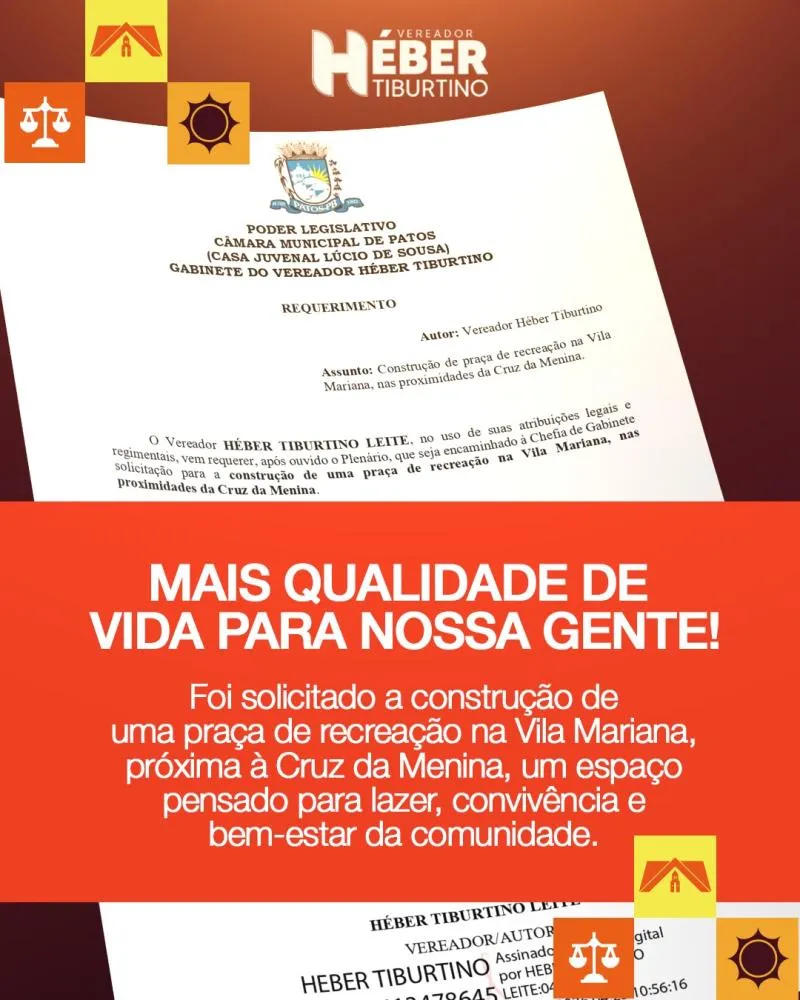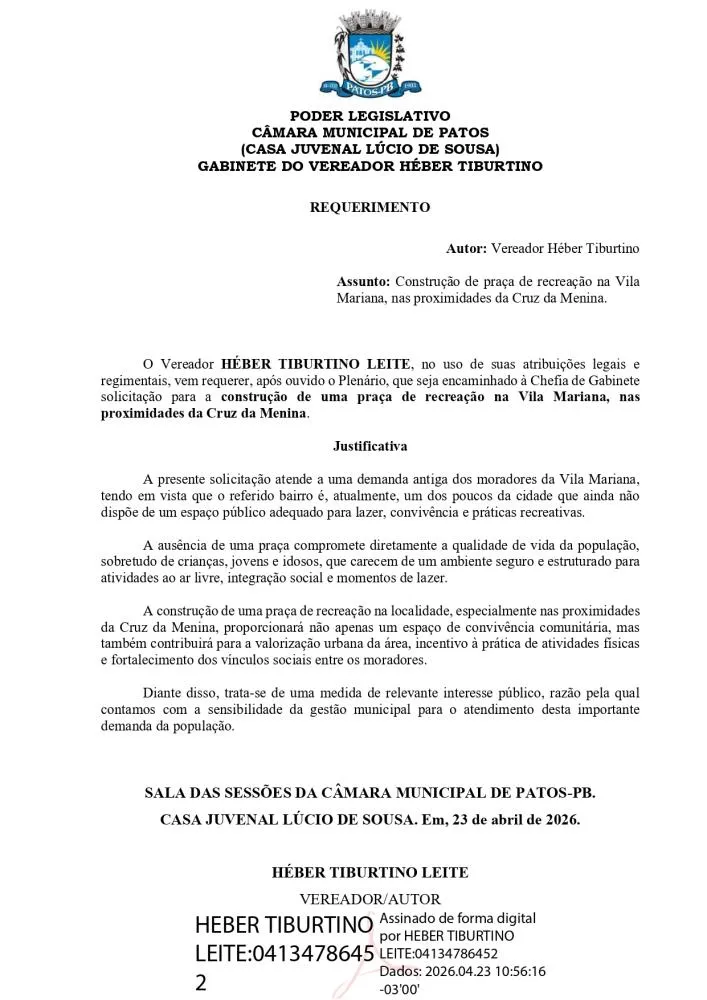 O vereador Héber Tiburtino (PP) apresentou, na Câmara Municipal de Patos, um requerimento solicitando à gestão municipal a construção de uma praça de recreação na Vila Mariana, nas proximidades da Cruz da Menina.