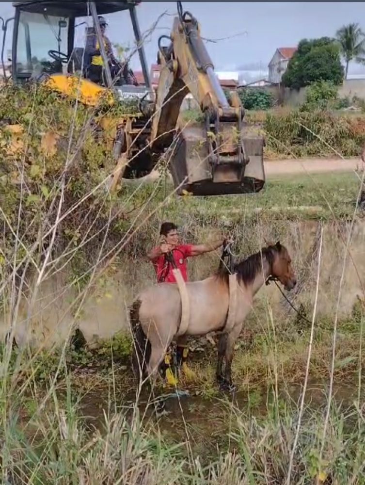 O Corpo de Bombeiros resgatou um cavalo que caiu no canal do Frango, comunidade do bairro Dom Bosco, em Patos.