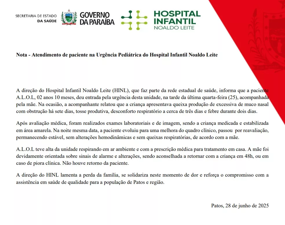 A direção do Hospital Infantil Noaldo Leite (HINL), em Patos, emitiu neste sábado (28) uma nota esclarecendo os procedimentos realizados durante o atendimento à menina Aylla Lavínia Oliveira Lima, de 2 anos e 10 meses, que faleceu na manhã da última quinta-feira (26), na UPA Dr. Otávio Pires de Lacerda.