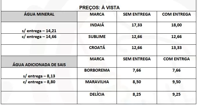 Na oportunidade, foram visitados 11 estabelecimentos que comercializam água e 13 que comercializam gás de cozinha, sendo constatada uma diminuição no valor da água mineral (sem entrega), de -2,80%, e com entrega, -2,72%. Na água adicionada de sais, sem entrega, o procon percebeu um aumento de 8,40%; já com entrega, foi percebida uma diminuição no valor de -4,86%.