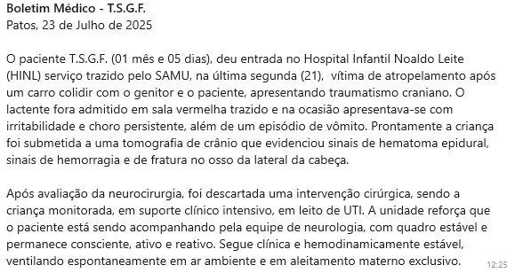 O Hospital Infantil Noaldo Leite (HINL), em Patos, atualiza nesta quarta-feira (23) o estado de saúde do bebê vítima de atropelamento ocorrido na última segunda-feira, 21 de julho.