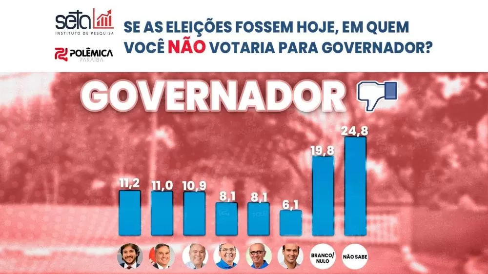 A pesquisa também mediu a rejeição para o Governo do Estado. Os mais rejeitados foram: Pedro Cunha Lima (11,2%), Efraim Filho (11,0%), Marcelo Queiroga (10,9%), Adriano Galdino (8,1%), Cícero Lucena (8,1%) e Lucas Ribeiro (6,1%).