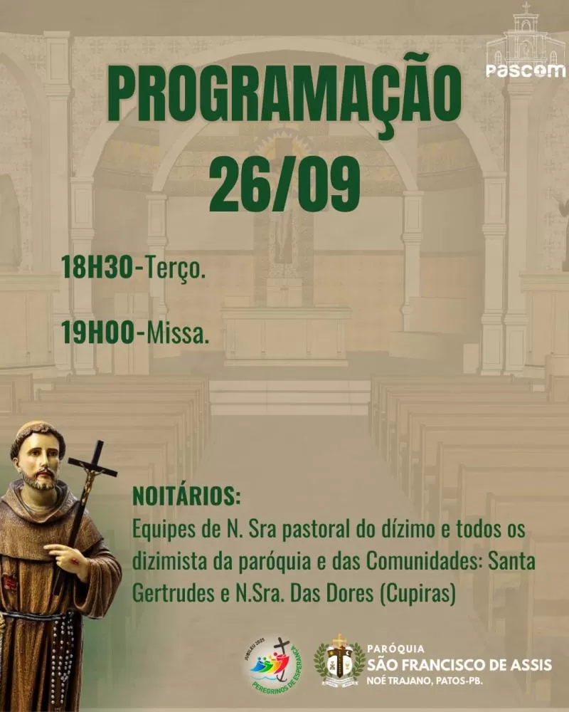 Com o lema “Onde houver desespero que eu leve a esperança”, a programação religiosa segue todas as noites até o dia 4 de outubro, sempre às 19h, com o novenário seguido da parte social no pavilhão da festa.