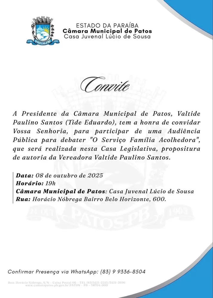 Na próxima quarta-feira, 8 de outubro, a Câmara Municipal de Patos vai abrir as portas para uma importante audiência pública que vai tratar do tema “O Serviço Família Acolhedora”. A reunião está marcada para as 19h, na Casa Juvenal Lúcio de Sousa, e é aberta a toda a população.