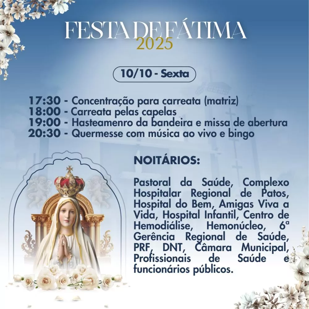 Com uma carreata saindo às 18h da Matriz e percorrendo as capelas do bairro Belo Horizonte, seguida do hasteamento da bandeira e da Missa de abertura, tem início nesta sexta-feira (10) a festa de Nossa Senhora de Fátima, padroeira do bairro, em Patos, Sertão da Paraíba.