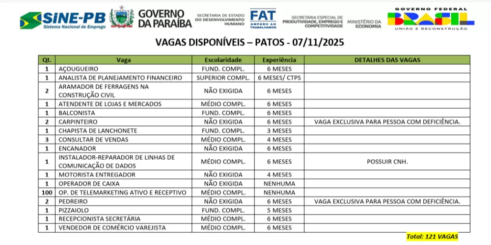 O Sistema Nacional de Emprego da Paraíba (Sine-PB) inicia, nesta segunda-feira (10), mais uma semana de atendimento com 121 vagas de trabalho disponíveis no município de Patos, no Sertão paraibano. As oportunidades abrangem diferentes níveis de escolaridade e setores como comércio, serviços, indústria e construção civil.