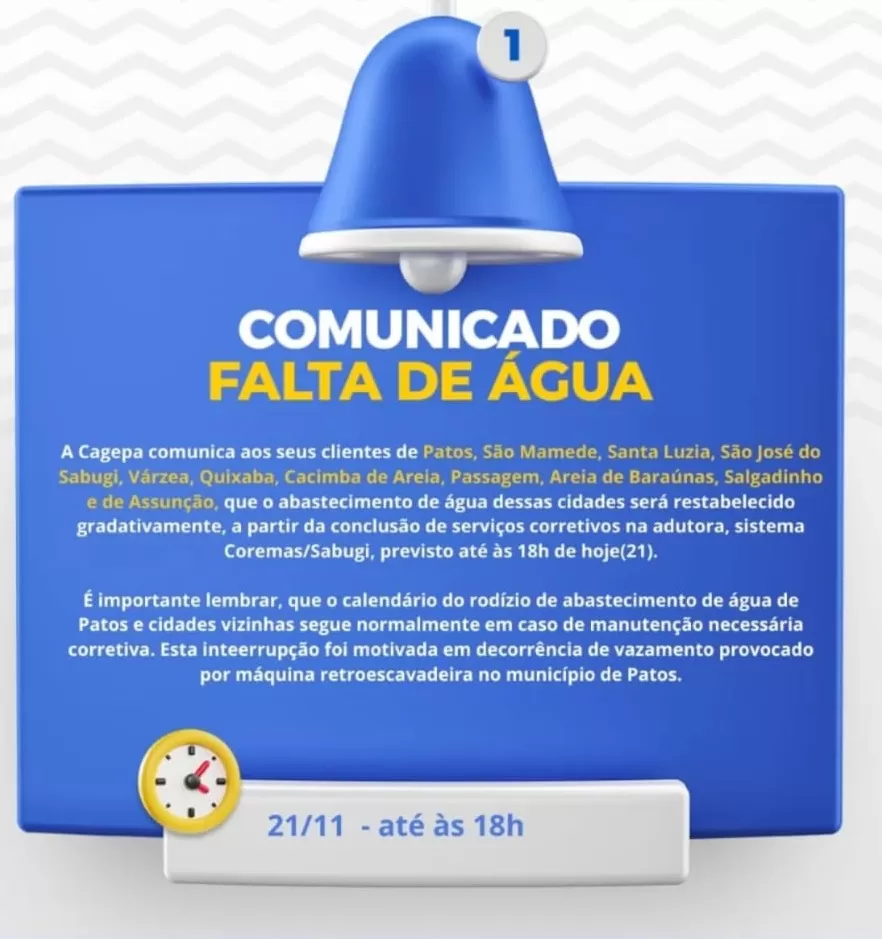 Segundo a CAGEPA, a interrupção foi motivada por um serviço de manutenção corretiva urgente após um rompimento na adutora do sistema Coremas/Sabugi, ocorrido em decorrência de um dano provocado por uma máquina retroescavadeira no município de Patos.
