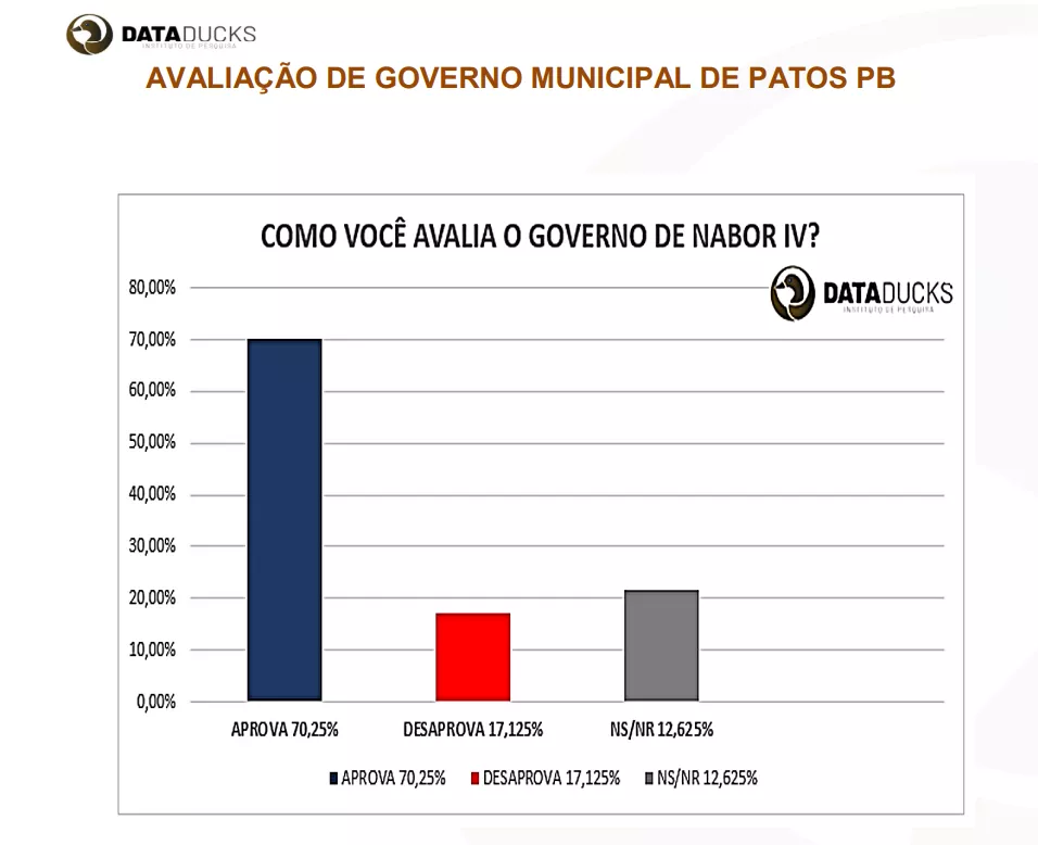 A mais recente pesquisa do Instituto DataDucks, em parceria com o Portal Patos Online, indica que o prefeito de Patos-PB, Nabor Wanderley (Republicanos), mantém alta aprovação entre os moradores do município. O levantamento, realizado entre os dias 13 e 15 deste mês, mostra que 70,25% dos entrevistados avaliam positivamente a administração.
