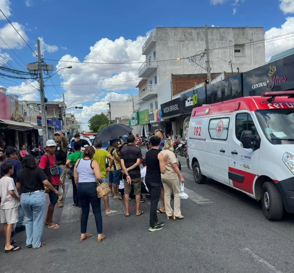 A comerciária Sabrina Sales, 25 anos, foi atropelada por um motociclista enquanto atravessava a faixa de pedestres na Rua Leôncio Wanderley, no Centro de Patos, no início da tarde desta quarta-feira (26).