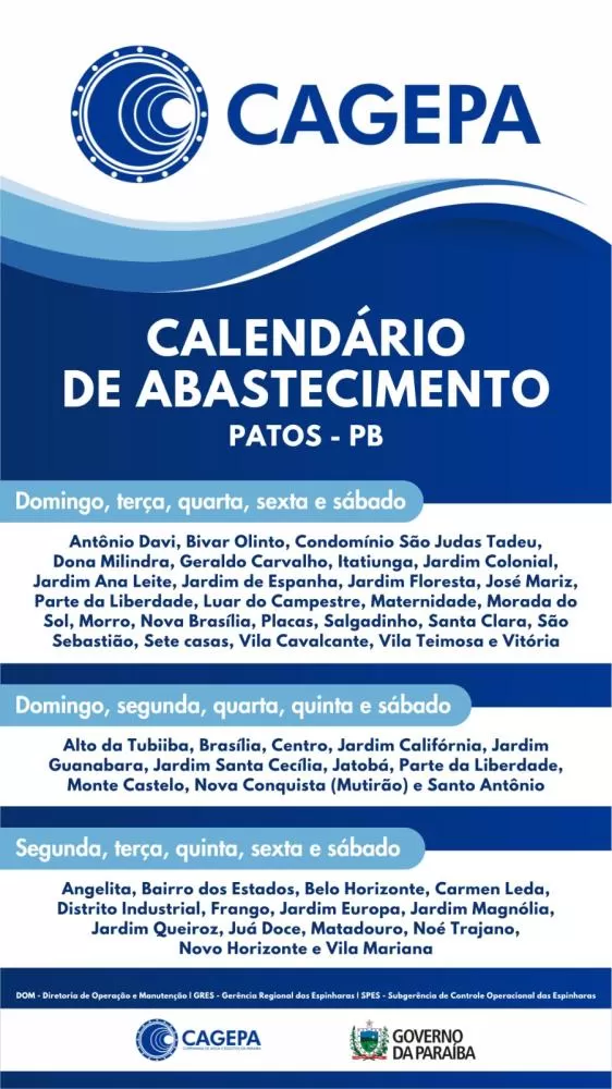 Conforme o novo cronograma estabelecido pela Cagepa, os bairros estão distribuídos em três grupos, cada um com dias específicos de abastecimento: