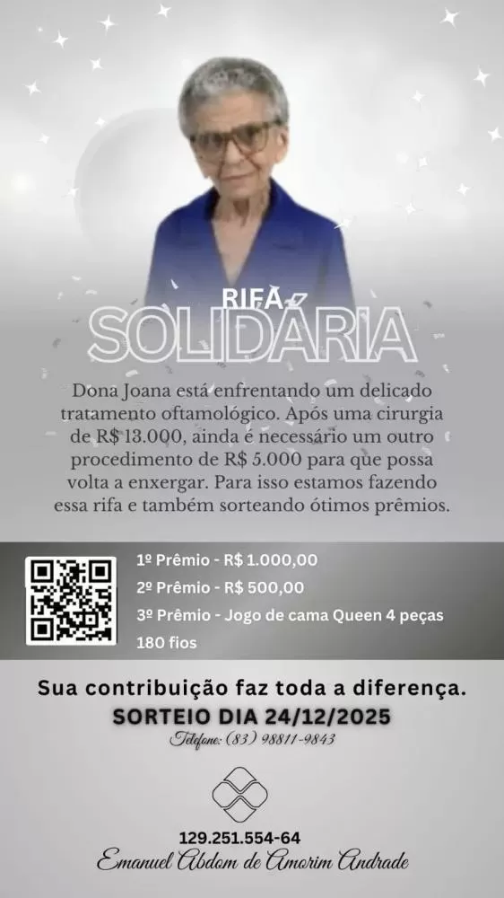 A família da idosa Joana de Amorim Silva, de 87 anos, moradora do bairro Dona Milindra, em Patos, no Sertão paraibano, está promovendo uma rifa solidária para ajudar a custear um delicado tratamento oftalmológico. A idosa já passou por uma cirurgia no valor de R$ 13 mil, mas ainda necessita de um novo procedimento, orçado em R$ 5 mil, para tentar recuperar a visão.