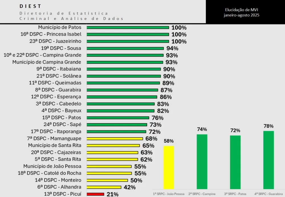O levantamento aponta que a unidade lidera os índices de elucidação e prisões, com 88% de resolução de mortes violentas e outros crimes, além de 100% de elucidação dos homicídios registrados na região, resultado que coloca a seccional no topo do desempenho estadual.